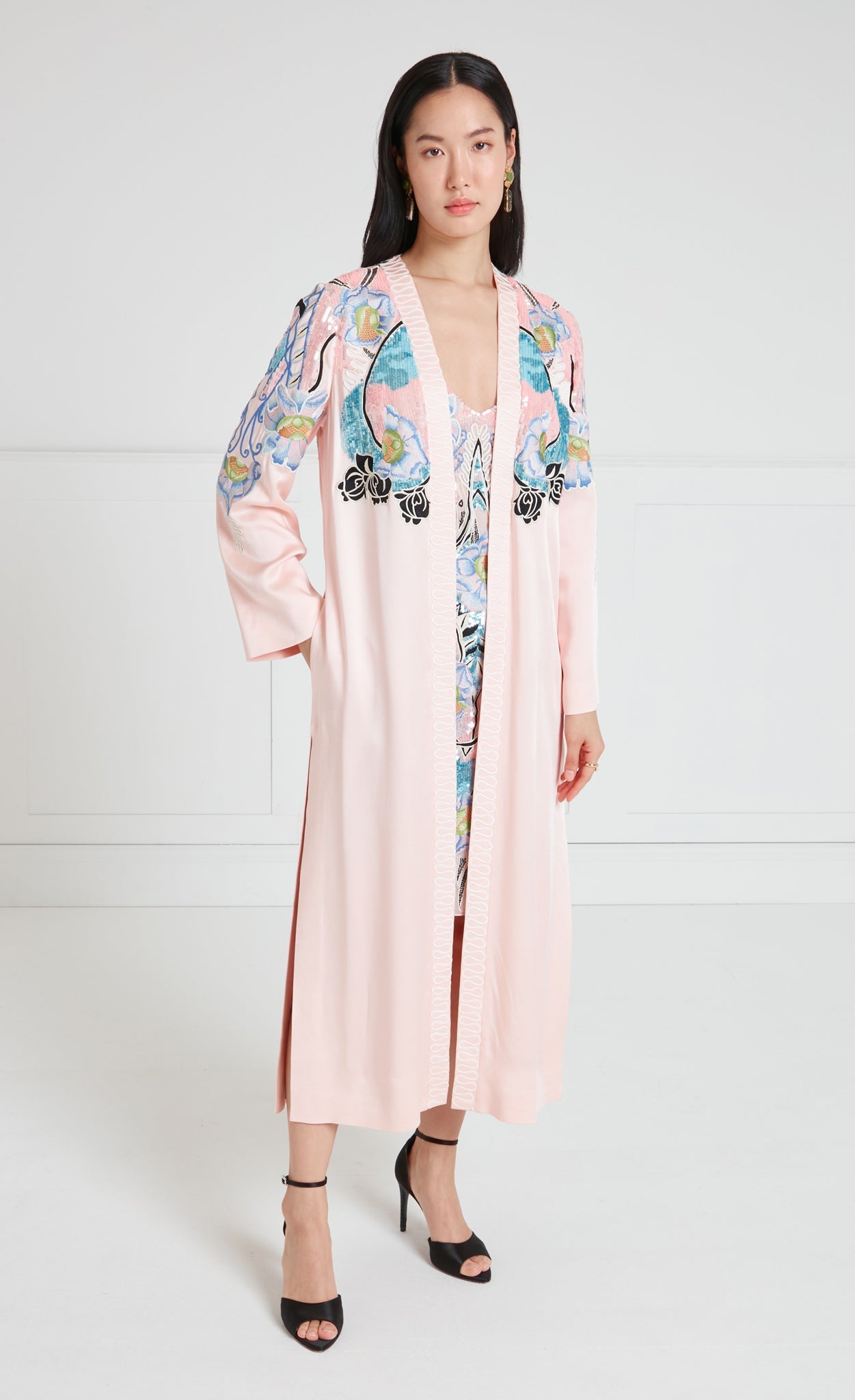 Crafted from a medium crepe satin, the coat has an elegant drape and luxurious weight. The fabric has a soft, velvety feel, which, combined with the artwork, creates dimensional texture and subtle shimmer.